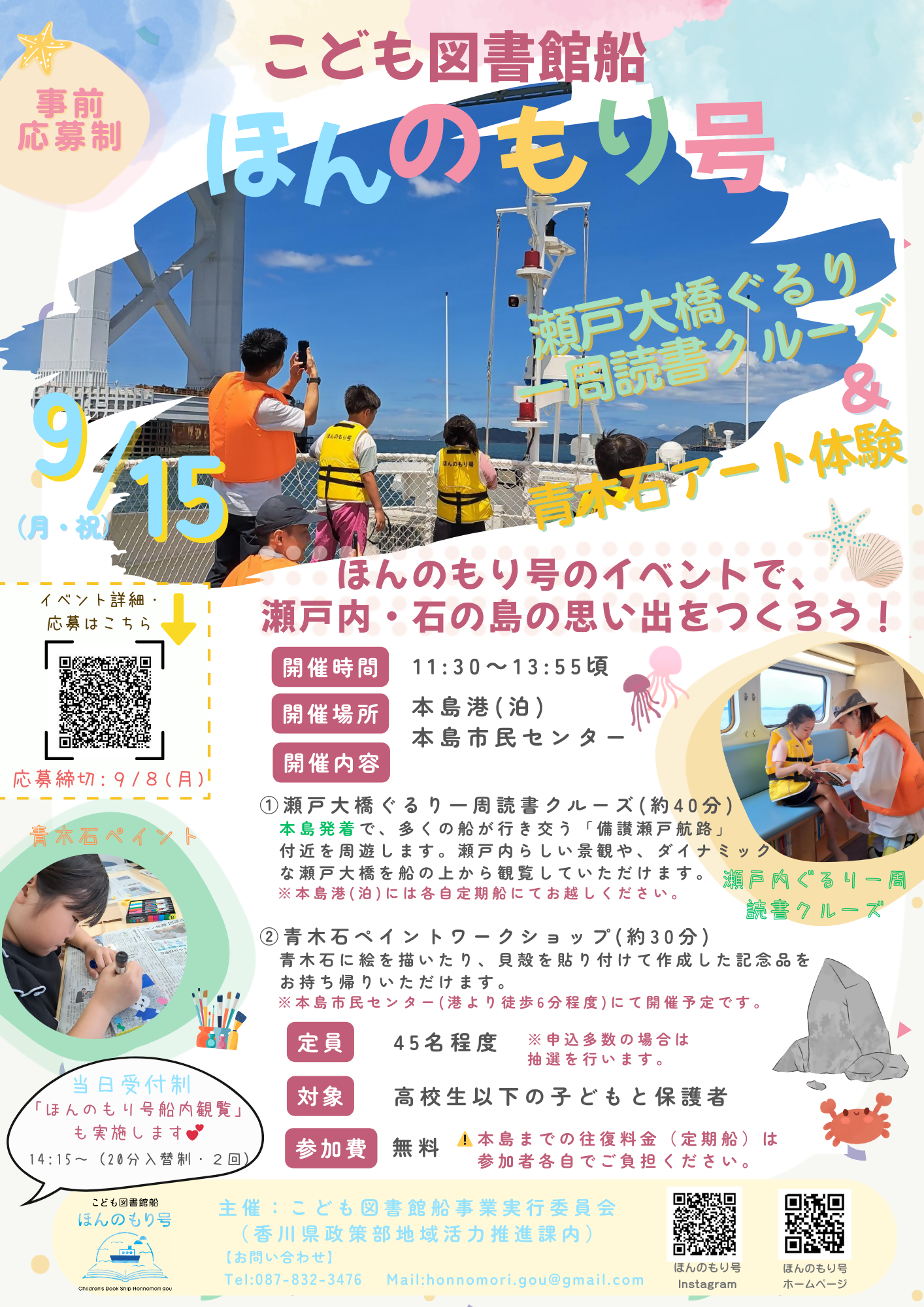 イベント詳細 日付: 9月 15, 2025 カテゴリ: 本島 概要 ほんのもり号で本島から瀬戸大橋まで一周するクルーズと、青木石をペイントするワークショップをセットで楽しめるイベントです。※同日開催 … 続きを読む 実行員会主催「瀬戸大橋ぐるり一周読書クルーズ&青木石アート体験」
