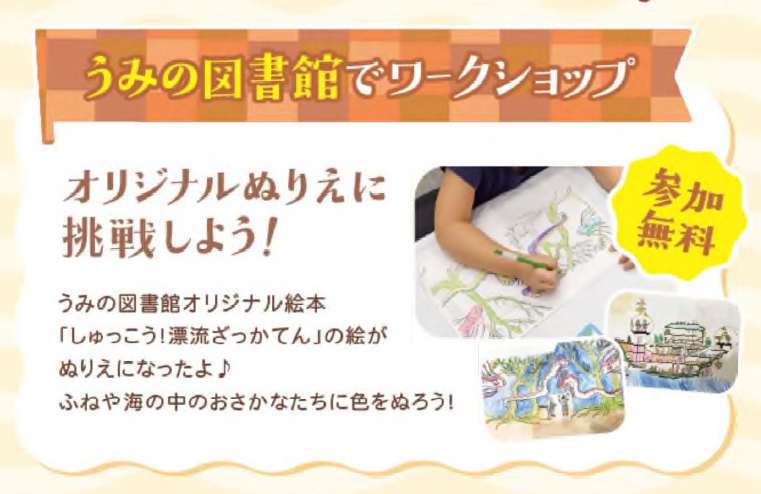 うみの図書館オリジナル絵本「しゅっこう!漂流ざっかてん」の絵のぬりえができます。