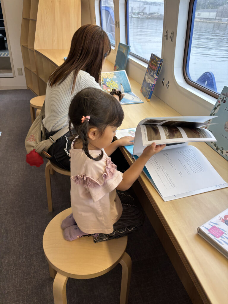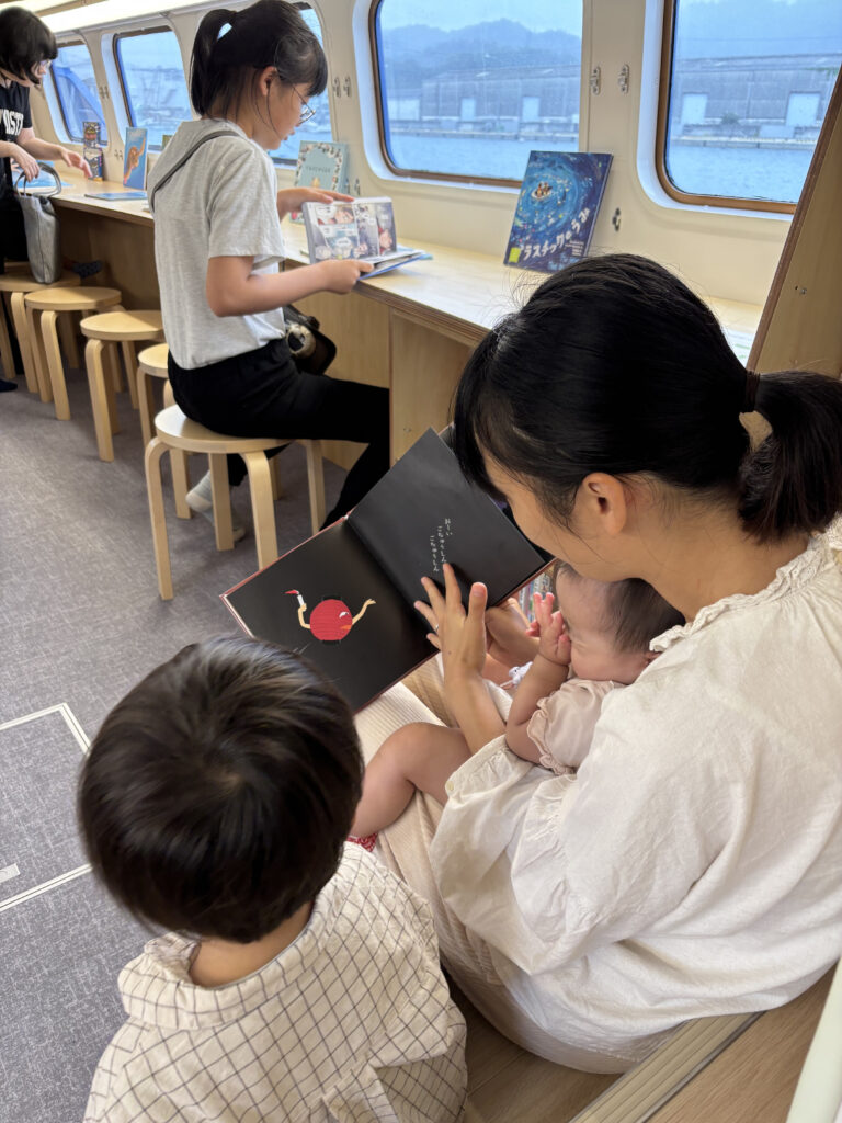ほんのもり号が津田港に寄港し、船内観覧や、本や海に関するワークショップ、絵本の読み聞かせを行います。
