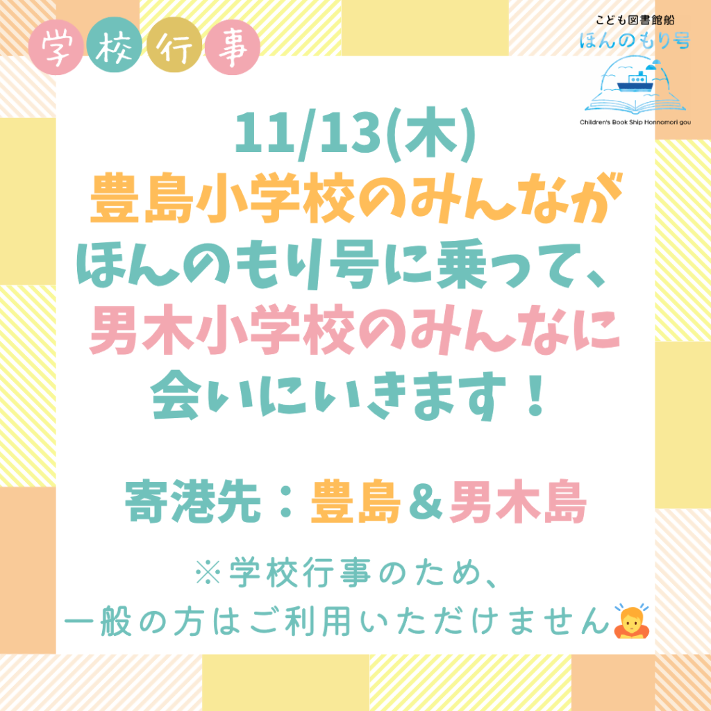 学校行事利用(島間交流) 豊島男木島 2025.11.13 イベント詳細 日付: 11月 13, 2025 カテゴリ: 豊島, 男木島 概要 日時 2025年11月13日(木)9:20~12:10 寄港先 豊島、男木島 備考 当日は、一般のお客様はご乗船いただけません。 このページをSNSでシェアする