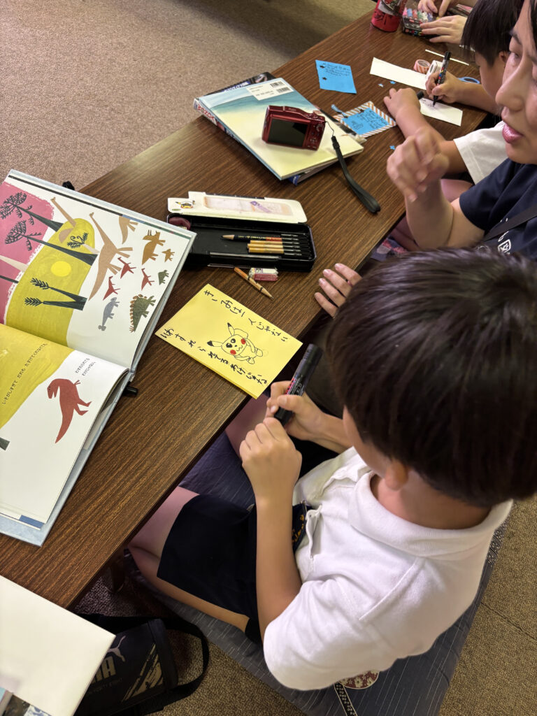 好きな形に切った紙に、それぞれ選んだ文・フレーズを書いたり絵を描いて、オリジナルのしおりが完成です!