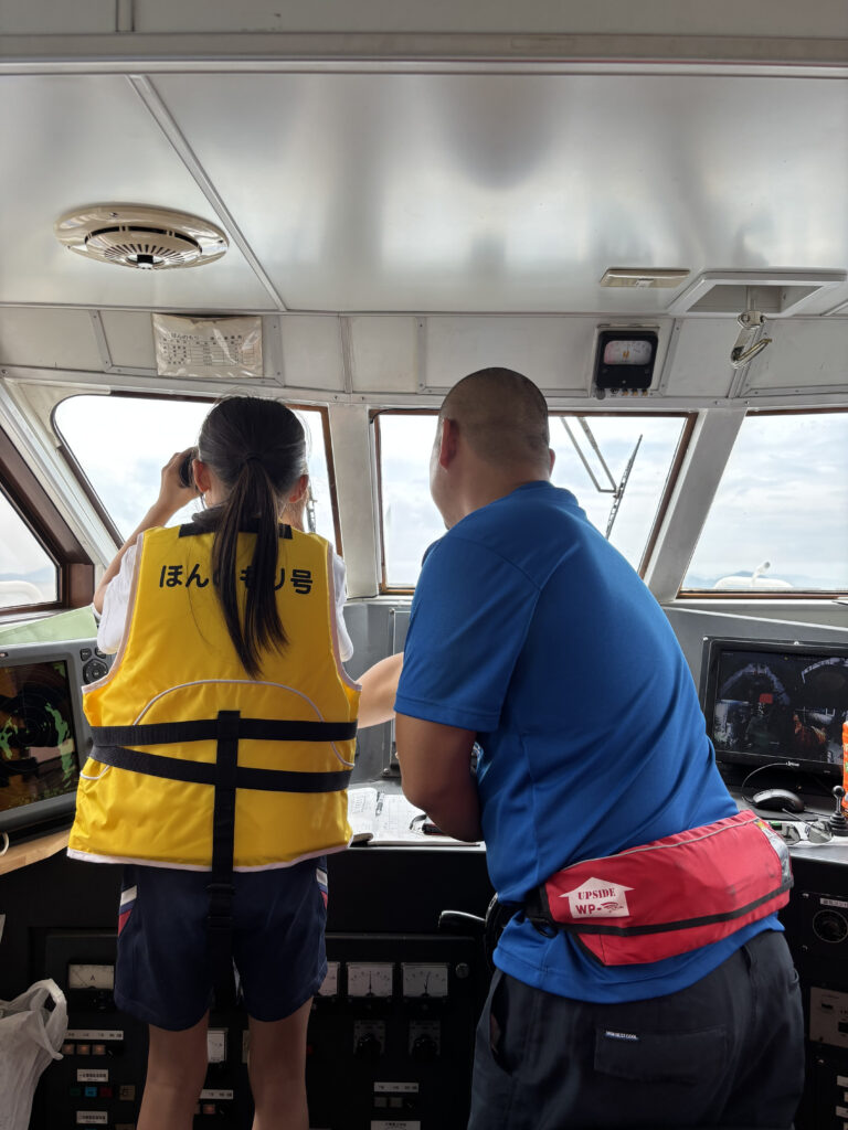 操縦室に入り、順番に船員さん体験も行いました。双眼鏡で遠くを見たり、機械の説明をきいたり、みなさん興味津々でした!