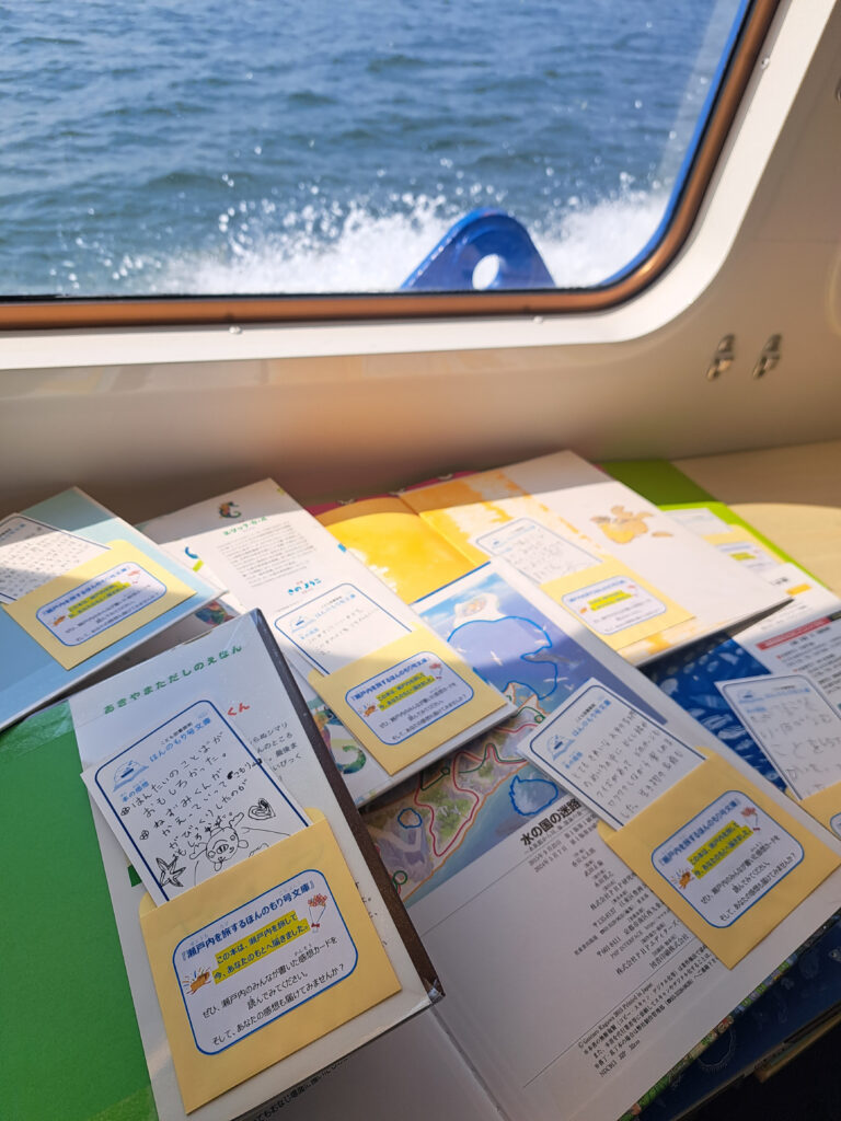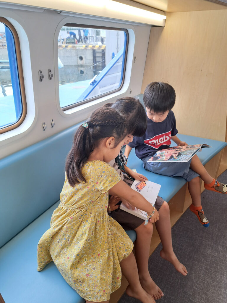 船内では、船内やデッキのベンチで絵本を真剣に読んでいるこども達の姿が見られました。